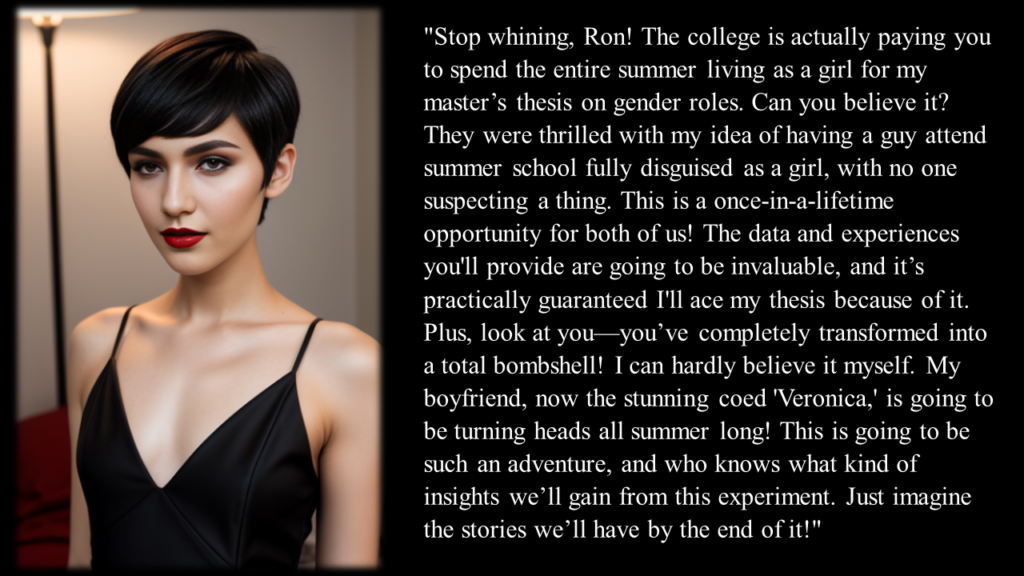 “Stop whining, Ron! The college is actually paying you to spend the entire summer living as a girl for my master’s thesis on gender roles. Can you believe it? They were thrilled with my idea of having a guy attend summer school fully disguised as a girl, with no one suspecting a thing. This is a once-in-a-lifetime opportunity for both of us! The data and experiences you’ll provide are going to be invaluable, and it’s practically guaranteed I’ll ace my thesis because of it. Plus, look at you—you’ve completely transformed into a total bombshell! I can hardly believe it myself. My boyfriend, now the stunning coed ‘Veronica,’ is going to be turning heads all summer long! This is going to be such an adventure, and who knows what kind of insights we’ll gain from this experiment. Just imagine the stories we’ll have by the end of it!”