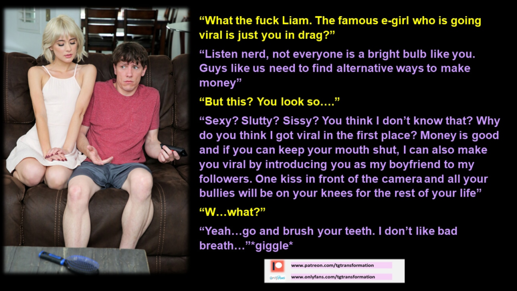 “Sexy? Slutty? Sissy? You think I don’t know that? Why do you think I got viral in the first place? Money is good and if you can keep your mouth shut, I can also make you viral by introducing you as my boyfriend to my followers. One kiss in front of the camera and all your bullies will be on your knees for the rest of your life”.