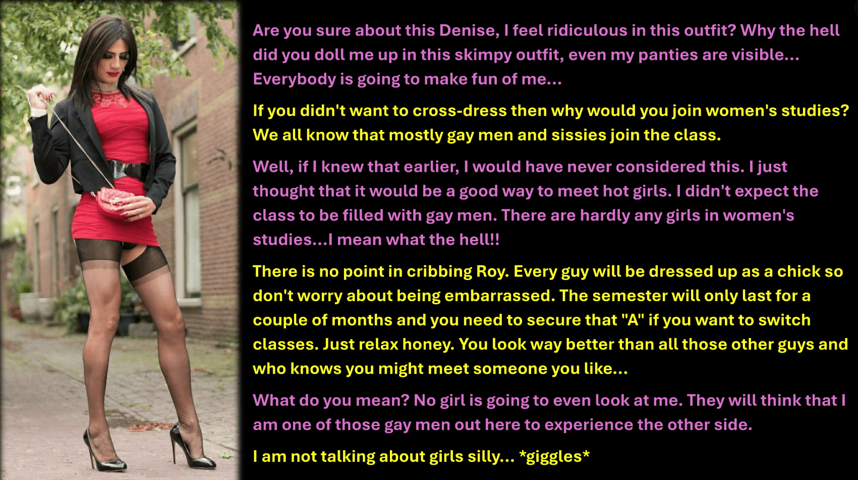 Are you sure about this Denise, I feel ridiculous in this outfit? Why the hell did you doll me up in this skimpy outfit, even my panties are visible… Everybody is going to make fun of me…