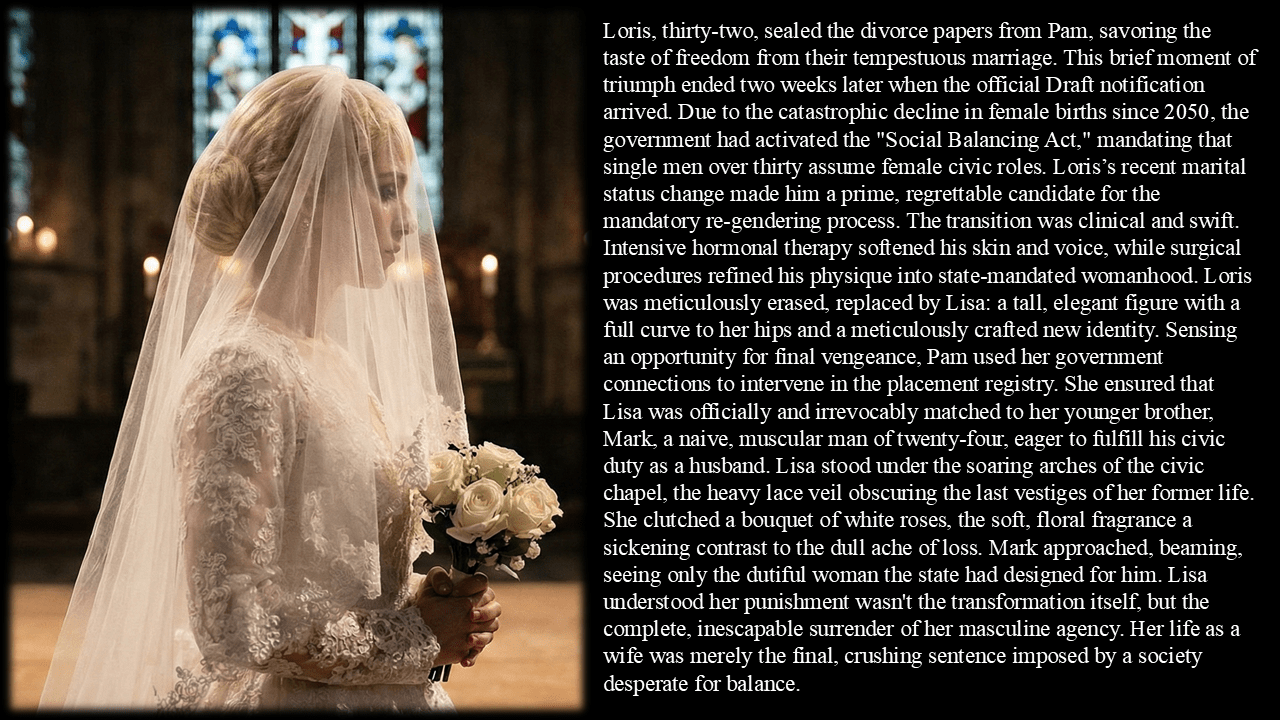 Loris, thirty-two, sealed the divorce papers from Pam, savoring the taste of freedom from their tempestuous marriage. This brief moment of triumph ended two weeks later when the official Draft notification arrived. Due to the catastrophic decline in female births since 2050, the government had activated the “Social Balancing Act,” mandating that single men over thirty assume female civic roles. Loris’s recent marital status change made him a prime, regrettable candidate for the mandatory re-gendering process. The transition was clinical and swift. Intensive hormonal therapy softened his skin and voice, while surgical procedures refined his physique into state-mandated womanhood. Loris was meticulously erased, replaced by Lisa: a tall, elegant figure with a full curve to her hips and a meticulously crafted new identity. Sensing an opportunity for final vengeance, Pam used her government connections to intervene in the placement registry. She ensured that Lisa was officially and irrevocably matched to her younger brother, Mark, a naive, muscular man of twenty-four, eager to fulfill his civic duty as a husband. Lisa stood under the soaring arches of the civic chapel, the heavy lace veil obscuring the last vestiges of her former life. She clutched a bouquet of white roses, the soft, floral fragrance a sickening contrast to the dull ache of loss. Mark approached, beaming, seeing only the dutiful woman the state had designed for him. Lisa understood her punishment wasn’t the transformation itself, but the complete, inescapable surrender of her masculine agency. Her life as a wife was merely the final, crushing sentence imposed by a society desperate for balance.