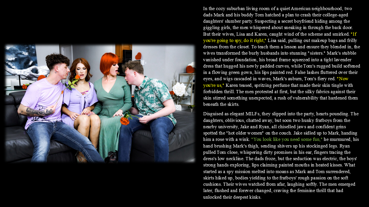 Disguised as elegant MILFs, they slipped into the party, hearts pounding. The daughters, oblivious, chatted away, but soon two hunky fratboys from the nearby university, Jake and Ryan, all chiseled jaws and confident grins spotted the “hot older women” on the couch. Jake sidled up to Mark, handing him a rose with a wink. “You look like you need some fun,” he murmured, his hand brushing Mark’s thigh, sending shivers up his stockinged legs. Ryan pulled Tom close, whispering dirty promises in his ear, fingers tracing the dress’s low neckline. The dads froze, but the seduction was electric, the boys’ strong hands exploring, lips claiming painted mouths in heated kisses. What started as a spy mission melted into moans as Mark and Tom surrendered, skirts hiked up, bodies yielding to the fratboys’ rough passion on the soft cushions. Their wives watched from afar, laughing softly. The men emerged later, flushed and forever changed, craving the feminine thrill that had unlocked their deepest kinks.