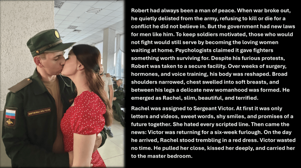 Robert had always been a man of peace. When war broke out, he quietly delisted from the army, refusing to kill or die for a conflict he did not believe in. But the government had new laws for men like him. To keep soldiers motivated, those who would not fight would still serveby becoming the loving women waiting at home. Psychologists claimed it gave fighters something worth surviving for. Despite his furious protests, Robert was taken to a secure facility. Over weeks of surgery, hormones, and voice training, his body was reshaped. Broad shoulders narrowed, chest swelled into soft breasts, and between his legs a delicate new womanhood was formed. He emerged as Rachel, slim, beautiful, and terrified.